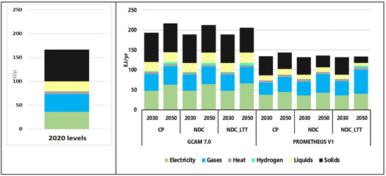 Globally, electricity and natural gas are the main energy sources used in residential and commercial buildings in 2020 [30]. In 2050, the GCAM and PROMETHEUS models project that the imposition of ambitious climate policies in the NDC_LTT scenario would result in large changes in the energy consumption and fuel mix in the sector compared to the CP scenario (Figure 5). First, both models show stronger energy efficiency improvements in the NDC_LTT driven by dedicated investment to reduce energy consumption (e.g., thermal renovation to improve shell’s insulation), reduced demand due to higher energy costs, and uptake of energy efficient appliances and equipment, in particular heat pumps. The projected energy demand reduction is larger in PROMETHEUS than in GCAM, as the former incorporates more details in the representation of energy efficiency actions and options and higher technological granularity in the buildings sector. Both models show an increasing contribution of electricity to cover the sector’s demand by 2030 and 2050, with the share of electricity increasing to more than 60% in the NDC_LTT scenario in 2050. Similar trends are evident in the other policy scenarios, but efficiency and electrification trends are of smaller magnitude compared to NDC_LTT. In contrast, the shares of gas, oil, and solids (including biomass) are projected to rapidly decline due to the imposition of ambitious climate policies promoting cleaner alternatives and energy efficiency, with fossil fuels increasingly replaced by low-emission fuels. Finally, the remaining quantities of solids refer to (traditional and modern) biomass, the use of which is projected to continue, albeit declining, by 2050, especially in low-income countries.