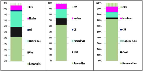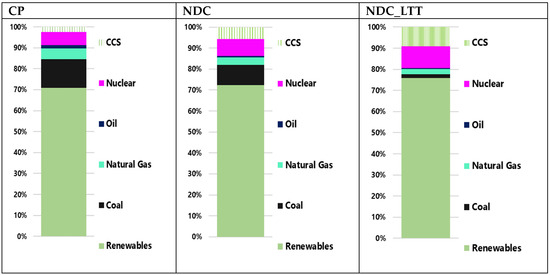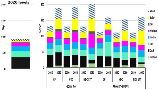 The imposition of Nationally Determined Contributions and Long-Term Targets would drive major changes in the global power generation mix, with a fast and massive uptake of renewable energy and Carbon Capture and Storage (CCS) combined with a large-scale reduction in fossil fuel use and a rapid phase-out of coal and lignite power plants both in developed and developing economies. In this scenario, the CCS route involves the application of post-combustion capture technologies while the CCU technologies are assumed to be deployed only in the long-term and only if mentioned in a national LTT. This entails the utilization of captured carbon dioxide for various purposes, such as the production of synthetic fuels, chemicals, and other valuable materials that contribute to the broader goals of sustainable resource use and emissions reduction. However, the transition pathway in the power sector differs in the two models, depending on specific model assumptions (e.g., about the costs and potentials of technologies and fuels by region). For example, in the NDC_LTT scenario, both GCAM and PROMETHEUS show that solar and wind power will become the major sources of electricity, increasing their share to about 45–55% in global electricity production, with PROMETHEUS being more optimistic about renewable energy uptake compared to GCAM. The latter model, however, projects a substantial contribution of nuclear power in the global power mix by 2050, with massive expansion of the nuclear plant fleet, especially in developing economies to cover part of their rapidly expanding electricity requirements (Figure 8).