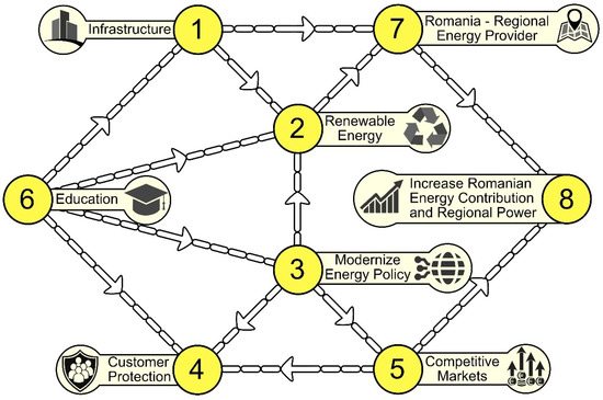 The block diagram of the Romanian Energy Strategy objectives based on their interconnectivity. The authors created this figure with data from the RES.