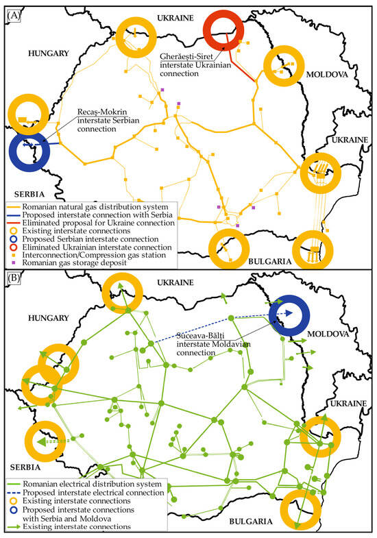 Romania’s interstate connections in a project for electrical energy and natural gas. (A) ENTSO-G Romania’s proposed connections; (B) ENTSO-E Romania’s proposed connections. The authors created this figure with data from the Romanian Energy Strategy [31] and the National Natural Gas Transport System Development Plan [59].