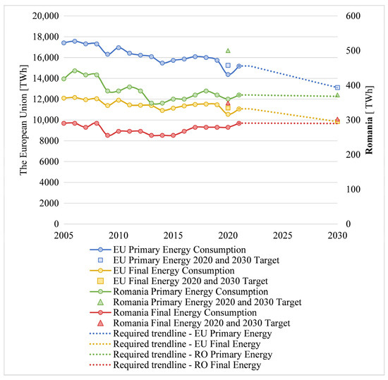 Primary and final energy consumption in the EU and Romania since 2005 to 2021, with targets for 2020 and 2030 [65].