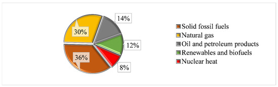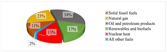 The EU target to increase the renewable share in energy production processes is well known. The latest available data, from 2021, about energy production in the EU is represented in Figure 5. The total energy production in 2021 increased by 6% compared to 2020 [66]. The share of renewables and biofuels as a source of energy was 17% in 2021, the same as in 2020. Oil, petroleum products, solid fossil fuels, and natural gas (all being fossil fuels) continue to contribute to a massive share of 68% in 2021, similar to 2020. Although the EU is a world leader when it comes to renewable energy policies and strategies, it still has a long road ahead to reach the desired threshold of 42.5% [33].