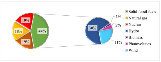 Romania aligns itself with EU regulations and is a strong supporter of the EU energy strategy. The Romanian energy production mix is presented in Figure 7. Compared to the EU, the energy production mix in Romania has some interesting differences. In percentages, Romania used 20% less oil and petroleum products than the EU average in 2021, 5% less nuclear heat, and 5% less renewable energy and biofuels. On the other hand, it used 25% more solid fossil fuels, both coal and wood, especially for urban and residential heating, and 7% more natural gas. The renewable energy production is quite low in Romania overall, but from the total electricity mix in Romania for 2021 (Figure 8), 44% of the electricity was generated from renewable sources, which is higher than the EU’s 37% in 2021 [71].