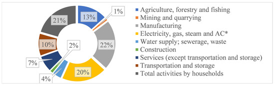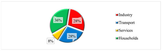 In the EU, around 40% of the total energy consumption comes from buildings and services [54], and since 2007, it has increased by approximately 5% for households and 2.4% for services. Industry accounts for approximately 25% of the energy consumption, as seen in Figure 6, and it fell by 12.4% in 2021 compared to 2007 [66]. Transport sector energy consumption was on the rise until 2019, compared with 1990 levels. International aviation skyrocketed by 90.9%, while rail and inland waterway levels dropped by around 30% and 23.5%, respectively. In 2018, the transport sector’s shares of energy consumption were 33.9% and 25.4% of total GHG emissions, respectively [70]. In 2021, energy consumption decreased by 29%, and GHG emissions dropped by 10%. This high decrease was caused by COVID-19, which halted almost all transport in 2020, but it is on the rise again.
