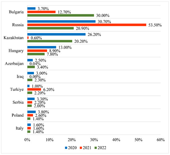 - Statistica. Distribution of Energy Products Imported in Romania from 2020 to 2022, by Country. Available online: https://www.statista.com/statistics/1385210/romania-distribution-of-energy-products-imported-by-country/ (accessed on 20 July 2023).