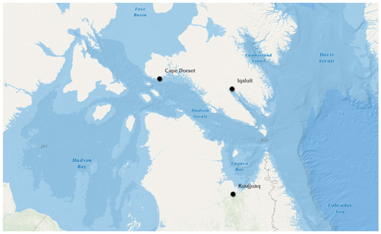Surface air temperature data (annual mean temperature, Tmean) were obtained from the Environment and Climate Change Canada archive (https://climate.weather.gc.ca/historical_data/search_historic_data_e.html (accessed on 15 July 2023)). Mean surface air temperatures were used to assess the temporal evolution of temperature in the Hudson Strait region at Cape Dorset (Kinngait), NU (64.23° N, 76.54° W), Iqaluit, NU (63.74° N, 68.52° W), and Kuujjuaq, QC (58.10° N, 68.42° W) (Figure 1). The climate records were uneven in data completeness. Data were available for Cape Dorset (Kinngait) for 1971, 1980–1993, 1995–1998, and 2000–2006. For Iqaluit, the following years were available 1971–1995, 2000–2006, and 2008–2018. For Kuujjuaq, the available years were 1971–2002, 2005, 2008–2013, and 2015–2018.