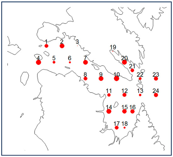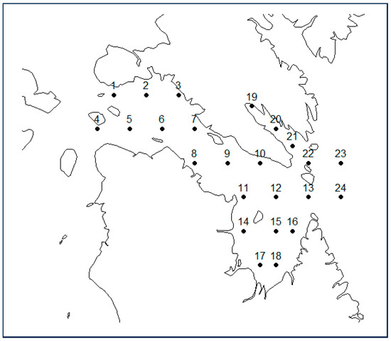 A grid of 24 discrete points was developed to represent Hudson Strait (Figure 2). In order to determine the breakup and freeze-up dates from 1971 to 2018 for each of the sampling locations for Hudson Strait, as described below, the same methodology utilized by others [9,14,15,16,17,18,19] was employed. Ice-free season length was derived from the difference of the other two metrics. The grid distancing was approximately 90 km. The locations were adjusted to adapt to the Hudson Strait coastline. We note, unlike satellite data, the points were discrete and not representing a grid box, as is the case with satellite data (pixels). Thus, the grid locations near coasts were not an amalgam of land and ice but unambiguous ice concentrations.