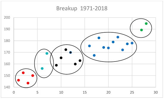 Spatial clusters for Hudson Strait as a function of the average breakup date (ordinal day of the year). The vertical axis is the day of the year when breakup occurs. The x axis is a counter for the 24 points with a blank between each cluster.
