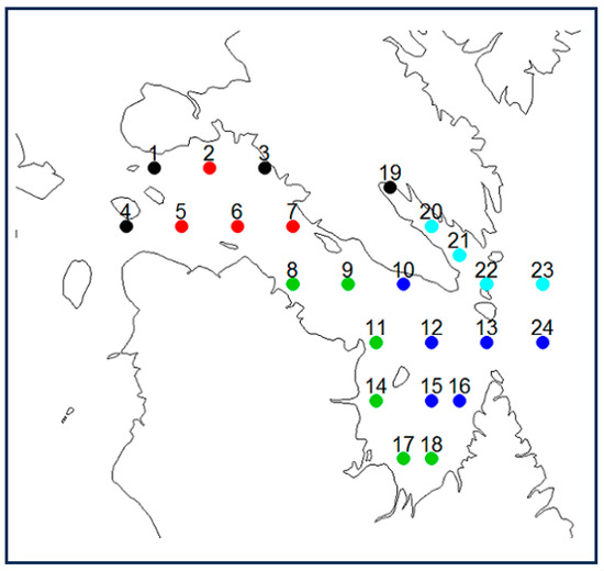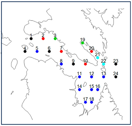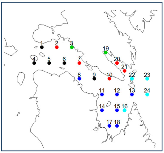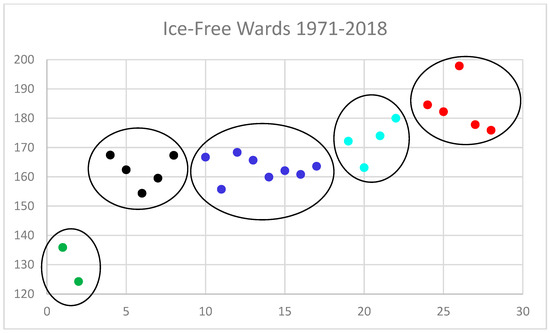 Finally, we examined the clustering for the ice-free season in Figure 10 and Figure 11. Figure 10 provides the order of shortest (green) to longest (red) ice-free season with the others in between (black, blue, turquoise). These clusters were reminiscent of those generated for the breakup analysis, including the green shoreline cluster (3, 19) and the blue one centred on Ungava Bay (11, 12, 13, 14, 15, 17, 18) (Figure 11). The others included a black western entrance cluster (1, 4, 5, 6, 9) and turquoise eastern exit cluster (22, 23, 24). The final cluster (red) was a north shore cluster (2, 7, 10, 20, 21). With a variation in a few points (5, 16, 21), the pattern was essentially the same as the breakup distribution. The green cluster (3, 19) was a notable outlier, as these points combined the latest breakup with the earliest freeze-up to form an anomalously (for Hudson Strait) short ice-free period and reflective of their proximity to the shore and isolation from the prevailing current flow.