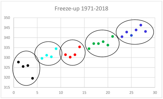 Spatial clusters for Hudson Strait as a function of the average freeze-up date (ordinal day of the year).