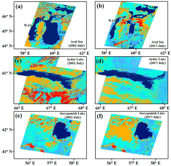 Water surface change in lakes selected as the study object in 2002 and 2017 (July), based on Landsat images: (a,b) Aral Sea including North Aral Sea (NAS), East Aral Sea (EAS), West Aral Sea (WAS), (c,d) Aydar Lake, and (e,f) Sarygamish Lake. The blue line outlines the lake’s shoreline.