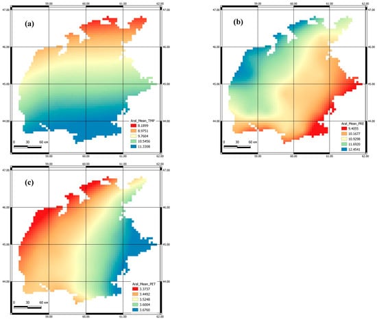 Over the past few decades, global warming and regional desiccation have been acute problems due to their major global effects. These processes are also serious problems in the Aral Sea region. As shown in Figure 3a, in climatology, the mean annual TMP rises from the northern part to the southern part of the sea. The highest temperature in the southeast of the region is 10–11 °C. Over the northern part of the Aral Sea, the mean annual temperature is around 8.2 °C. In the Aral Sea, the mean annual temperature is 9 °C. The spatial distribution of mean annual precipitation (Figure 3b) decreases from the northeast part of the sea to the southwest, with the lowest value (6–8 mm) prevalent in the desert areas around the Aral Sea. The distribution of PET resembles the distribution of temperature, i.e., high PET in areas where high temperatures are observed and vice versa (Figure 3c).