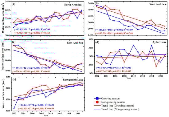 The alteration of water surface area in five lakes, namely the North Aral Sea (a), West Aral Sea (b), East Aral Sea (c), Aydar Lake (d), and Saryqamish Lake (e). The blue line signifies the growing season, while the red line represents the non-growing season.