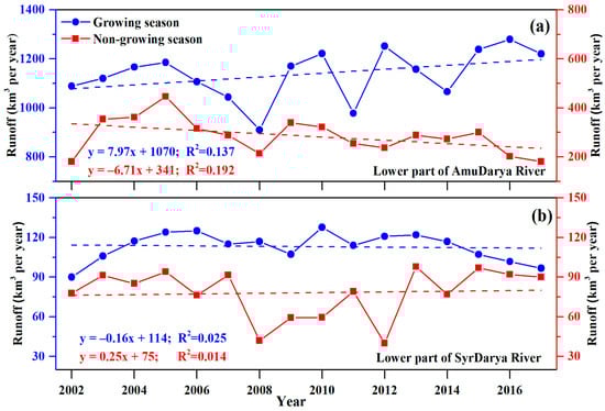 Runoff trends in the lower part of (a) the Amu Darya River and (b) the Syr Darya River from 2002 to 2017.