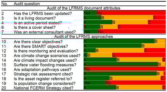 In order to audit whether the LFRMSs are adequately accounting for climate change-induced risk increases and meeting certain legal requirements, a method of expert evaluation of the strategies was applied that assessed them against a mix of qualitative and quantitative criteria. This method is similar to those of [,], who developed their evaluation criteria from the legal requirements listed in the F&WMA2010 and the guidance points developed by the LGA []. However, this study will look at a range of “audit” questions that will indicate the extent to which the LFRMSs have appropriately assessed and managed local flood risk and how they are accounting for climate change.