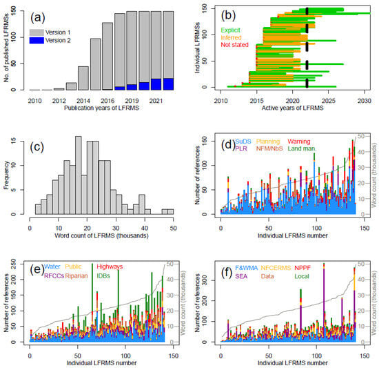 A detailed presentation of the data collected from the audit. (a) Cumulative publication year data of the 1st and 2nd versions of the LFRMSs. (b) Horizontal lines representing the active period of the 141 LFRMSs examined. These are ordered vertically for the different LLFAs by the publication date of their most recent LFRMS. The line is green if the active period is explicit, orange if implied (i.e., it can be inferred from other information in the LFRMS), or red if it is not stated and not clear from other information. (c) Frequency distribution plot for the word counts of the 141 LFRMS. (d) Stacked bar graph showing the number of references in each LFRMS to a selection of resilience-focused FRM interventions: sustainable drainage systems—blue; property-level resilience—magenta; spatial planning—yellow; natural flood risk management/nature-based solutions—brown; flood warning systems—red; land management/upland water storage—green. The LFRMSs are ordered by word count, which is shown as the grey line. (e) As for (d), but examining stakeholders that should be consulted: water companies—blue; regional flood and coastal committees—magenta; riparian land owners—brown; the public—yellow; the Highways Agency—red; internal drainage boards—green. (f) As for (d), but examining policies and datasets that should be referred to: Flood and Water Management Act (2010)—blue; the Strategic Environmental Assessment—magenta; National FCERM Strategy—yellow; flood risk datasets—brown; National Planning Policy Framework—red; the local plan—green).