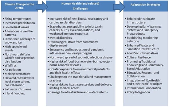 Strategies for adaptation and resilience-building should also prioritize Indigenous knowledge systems, incorporate local perspectives, and foster collaboration between all stakeholders. Despite the extensive scientific discussion, there have been limited studies integrating research from the Arctic countries and focusing on actual adaptation efforts across various decision-making levels. Thus, in this study, an attempt is made not to encompass all related literature, but rather to seek to address the gap by conducting a literature review. The paper endeavors to assess the impact of climate change on human health in the northern latitudes and to compile proposed adaptation strategies from the Arctic countries to mitigate these effects. It was executed in three phases: (i) identifying climate change challenges in the Arctic and its regions; (ii) assessing climate change impact on human health in its different aspects; and (iii) recognizing adaptation strategies within the health sector. We anticipate our findings will not only guide future research on effective health system adaptation strategies across diverse countries in the northern regions, but also illuminate the factors influencing and hindering climate change adaptation in the healthcare system in the Arctic.
