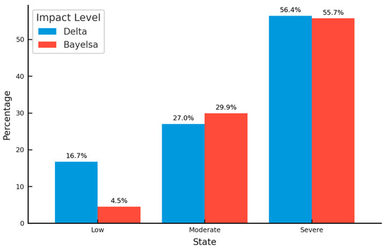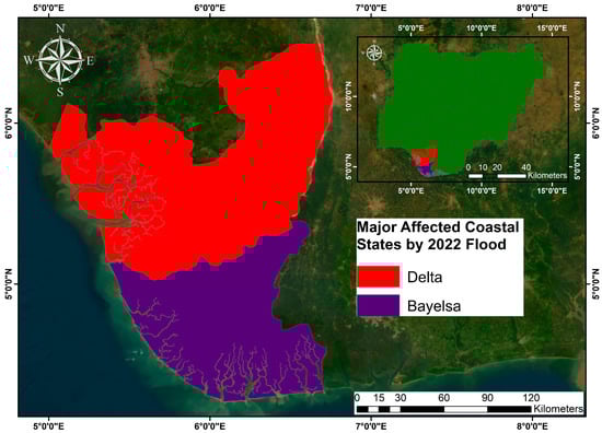 23]. In the 2022 floods, rural areas of the two coastal states experienced significant impact, with 74% of households affected, compared to about 40% in urban areas. Bayelsa was particularly hard-hit, with a majority of residents affected. This stark contrast highlights the region’s vulnerability and the critical need for targeted flood preparedness and intervention strategies.