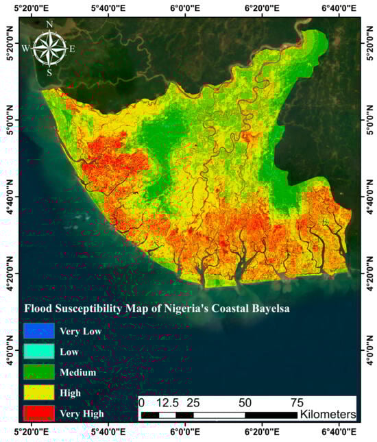 Figure 10 shows the comprehensive flood susceptibility map of Bayelsa State, Nigeria. Quantitative The distribution of flood susceptibility map levels in the coastal Bayelsa region is shown in