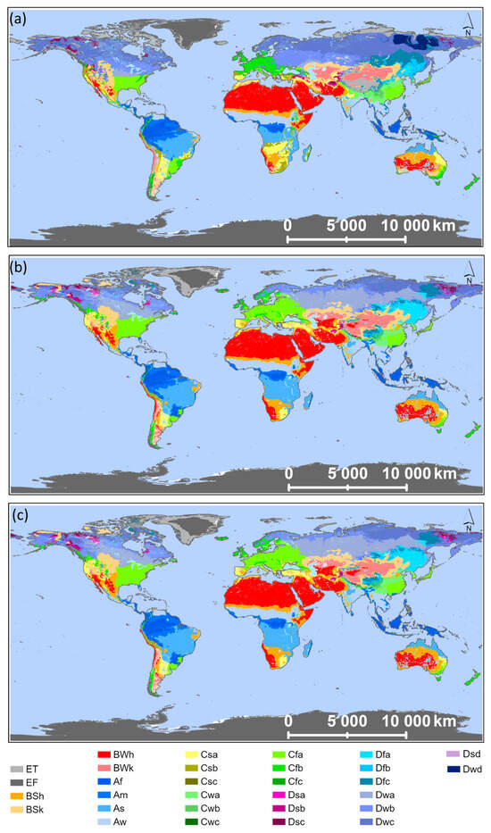 Figure 2. Worldwide Köppen–Geiger (KG) classification system between (a) 1970 and 2000, (b) from 2041 to 2060 under SSP2, and (c) from 2041 to 2060 under SSP5.