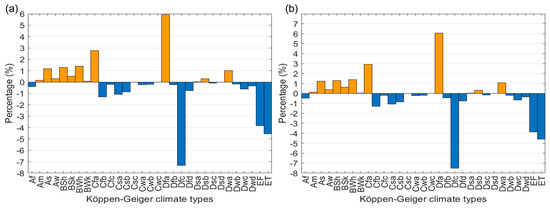 Figure 3. Percentage of the difference (in pixels) between the future 2041 to 2060 (a) under SSP2, and (b) under SSP5, and the historical (1970–2000) periods for each Köppen–Geiger (KG) climate type (values in Table A4).