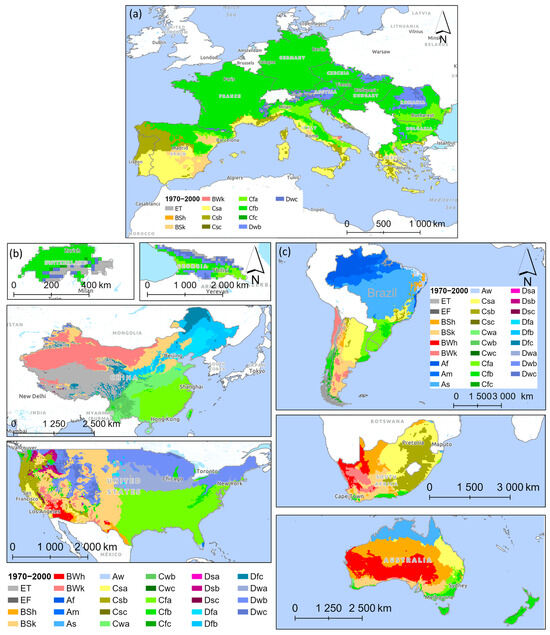 Figure 4. Worldwide Köppen–Geiger (KG) classification system of the major wine producers’ countries for the (a) European Union (EU) countries; (b) Northern Hemisphere (NH) non-EU countries; and (c) Southern Hemisphere (SH) between 1970 and 2000.