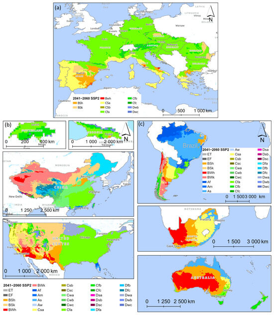 Figure 5. Worldwide Köppen–Geiger (KG) classification system of the major wine producers’ countries for the (a) European Union (EU) countries; (b) Northern Hemisphere (NH) non-EU countries; and (c) Southern Hemisphere (SH) from 2041 to 2060 under SSP2.