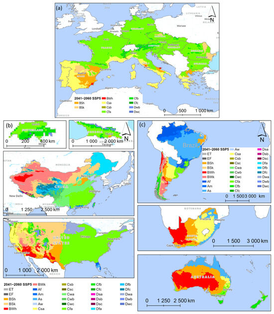 Figure 6. Worldwide Köppen–Geiger (KG) classification system for the major wine producers’ countries for the (a) European Union (EU) countries; (b) Northern Hemisphere (NH) non-EU countries; and (c) Southern Hemisphere (SH) from 2041 to 2060 under SSP5.