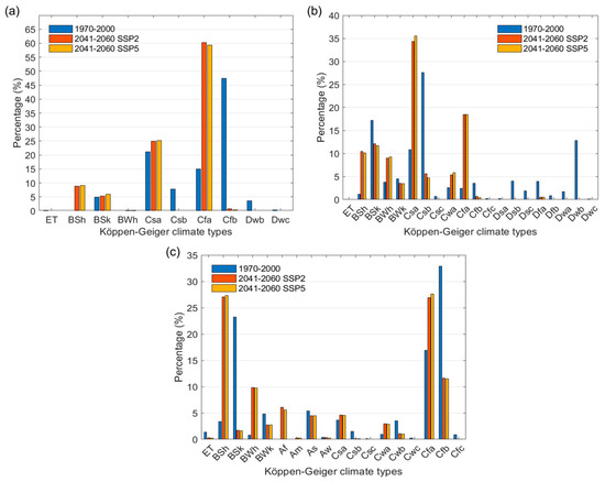 Figure 7. Köppen–Geiger climate type percentage of change within the study regions with vineyards (a) EU; (b) other NH countries; and (c) SH countries, for 1970–2000 and 2041–2060 under SSP2 and SSP5 for each climate type (values in Table A5).