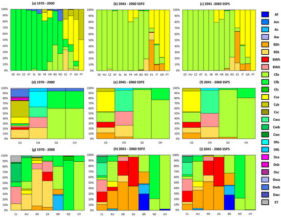 Figure 8. Köppen–Geiger (KG) climate type percentage of change per country within the study regions with vineyards (ac) EU, (df) other countries in the NH, and (gi) SH countries for 1970–2000 (left column) and 2041–2060 under SSP2 (middle column) and SSP5 (right column) for each climate type (values in Table A6, Table A7 and Table A8).