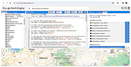 The aim of this research is to quantify the effects of climate-induced changes in temperature and precipitation on crop yields and water availability, to identify vulnerable areas and communities for targeted interventions, and to recommend adaptation strategies that are tailored to the specific needs and conditions of the region. The ultimate goal is to provide stakeholders with the necessary knowledge and tools to build a sustainable and resilient future for the region, preserving its agricultural heritage and ensuring socio-economic stability in the face of climate change. This study was carried out using the Google Earth Engine platform, and the related JavaScript code is presented in Figure 1.