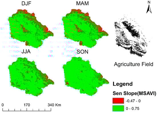 An integration of CMIP6 climate data, Landsat imagery, and ESA land use data was then conducted. We used Sen’s slope analysis to identify trends in the MSAVI values across different seasons (December, January, February, or DJF; March, April, May, or MAM; June, July, August, or JJA; and September, October, November, or SON), that offered insights into the health and productivity of vegetation. Sen’s slope is defined as follows [21]: