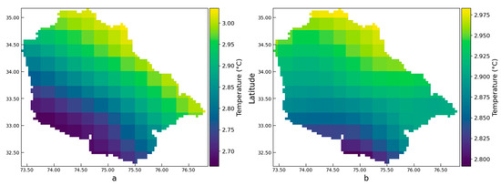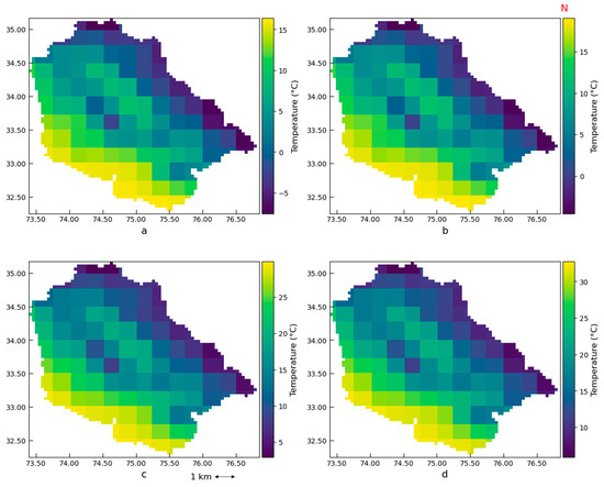 The observed spatial–temporal variations in temperature across the study area, as illustrated in Figure 10 for the years 2005, 2010, 2015, and 2020, reveal significant fluctuations that demonstrate a clear shift in temperature patterns, with the color gradients signifying changes in temperature that potentially correlate with crop viability and phenological shifts. There are discernible trends that could contribute to changes in agricultural productivity. For instance, areas exhibiting consistent warming trends are indicative of altered growing seasons, which can affect the types of viable crops, as well as their expected yields and the sustainability of agricultural practices.