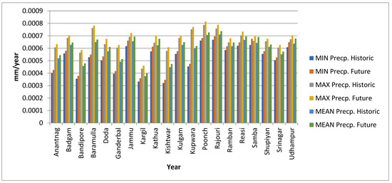 The effects of climate change on food security, as well as an examination of zonal precipitation patterns, provide essential information about the study area. As depicted in Table 6 and Figure 7, the data indicate a steady rise in precipitation levels across different zones. For instance, the lowest recorded historical precipitation in Chamba is 0.139722 mm/year, which is projected to increase to 0.149094 mm/year in the future. This pattern holds true for maximum precipitation, which is expected to rise from 0.221102 mm/year historically to 0.23836 mm/year in the future. The study area’s food security is influenced by the effects of climate change, and the analysis of zonal precipitation patterns is crucial. The data in Table 6 and Figure 7 reveal a consistent increase in precipitation across all zones, with the mean precipitation rate in Chamba projected to increase from its historical value of 0.192547 mm/year to a future mean of 0.205358 mm/year. Additionally, the future precipitation is anticipated to be more variable, as indicated by the rise in the SD.