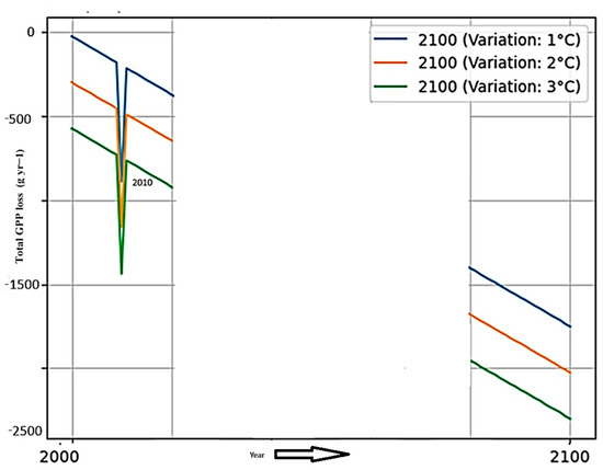 GPP loss projection from 2000, 2010, and 2100 due to a rise in temperature.