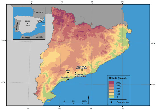 Localization of Valls, La Bisbal del Penedès, Tarragona, and Vilafranca del Penedès, showing their altitude above sea level and distance from the Mediterranean Sea.