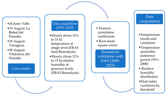 Figure 3 shows the methodology workflow. This research used temperature data from the ERA5 LAND reanalysis from the Copernicus Climate Change Service, which provides temperature information at an hourly temporal resolution and a spatial resolution of a 0.1° latitude and 0.1° longitude regular grid [55]. The dataset was downloaded for the day of each exhibition from 1951 to 2023—Valls on 24 June; La Bisbal del Penedès on 15 August; Tarragona on 19 August; and Vilafranca del Penedès on 30 August—and for the peak performance hours of the human-tower events (i.e., noon, 1:00 p.m., 2:00 p.m., and 3:00 p.m.) of the grid boxes in which the four human tower places are located.