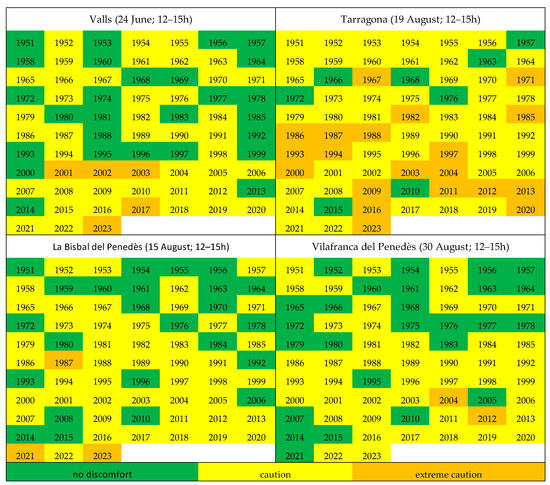 Figure 5 shows the Heat Index (HI) values from 1951 to 2023 in Valls (i.e., above left), La Bisbal del Penedès (i.e., below left), Tarragona (i.e., above right), and Vilafranca del Penedès (i.e., below right), following the thresholds mentioned in the Methodology section. No year had an HI value exceeding 40 °C (i.e., danger or extreme danger).