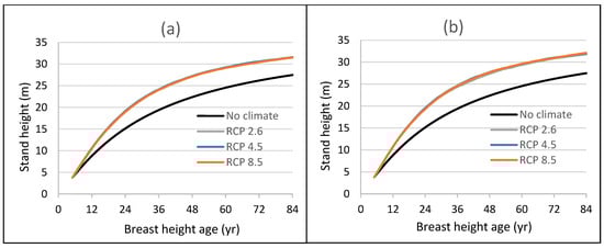 In the case of trembling aspen stand height growth, the overall effects of climate were positive under all emission scenarios at all locations (Figure 3). At a particular location, height growth curves under all three scenarios were almost indistinguishable from one another. The variation in climate effects on the height growth was not pronounced across locations. Stand heights at a BHA of 81 years under RCP 8.5 at western, far western, eastern, and central areas were taller by 12.22, 12.44, 12.78 and 14.37%, respectively, than those estimated using Equation (3) without climate variables.