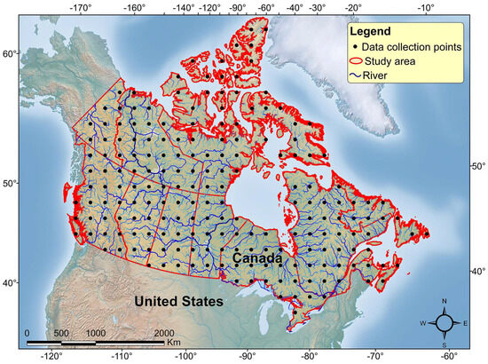 The study area is located between Long (longitudes) 141° 01′ W–52° 37′ W and Lat (latitudes) 41° 40′ N–83° 8′ N, which includes the 10 Canadian provinces—Newfoundland and Labrador (NL), Nova Scotia (NS), Prince Edward Island (PE), New Brunswick (NB), Quebec (QC), Ontario (ON), Manitoba (MB), Saskatchewan (SK), Alberta (AB), and British Columbia (BC)—and the three territories—Northwest Territories (NT), Nunavut (NU), and Yukon (YT) (Figure 1). A total of 199 sample points were selected across Canada, and the input data for climate change models were prepared for these points. Figure 1 shows the distribution of data collection points in Canada.