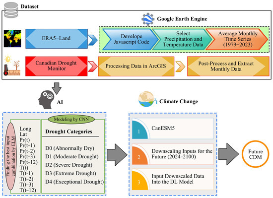 The main aim of the current study is to present a comprehensive approach to drought zoning in Canada, integrating data from the CDM, ERA5-Land, and an advanced deep learning technique. These resources provide an in-depth analysis of historical drought patterns and projections for future trends up to 2100. Enhanced data utilization was achieved by combining data from the CDM provided by the Government of Canada with daily data from ERA5-Land, creating a robust time series of average monthly precipitation and air temperature data for 199 sample locations in Canada from 1979 to 2023. The gaps in the data labeled “drought not analyzed” by the Canadian government were filled using the deep learning model presented in this research, and the future values for these points were calculated. A CNN model was employed to calculate CDM values based on the collected data, crucially filling gaps in the data provided by the Government of Canada and enabling a comprehensive representation of historical drought points across Canada. Future precipitation and temperature trends until 2100 were projected using the 6th Intergovernmental Panel on Climate Change (IPCC) report and four climate change scenarios derived from the CanESM5 model, and these projections were integrated into the CNN model to forecast future CDM values, enabling drought zoning based on four distinct future scenarios. This approach facilitates informed decision-making for future planning and policy development to mitigate and adapt to drought conditions. A robust framework for understanding and preparing for the impacts of climate change on drought occurrences in Canada is provided by the utilization of the CNN model and climate change scenarios from the 6th IPCC report. Through the delineation of potential drought zones under various future scenarios, this research aims to support policymakers, resource managers, and stakeholders in implementing proactive measures to mitigate the effects of drought and ensure the resilience of Canadian communities and ecosystems in the face of changing environmental conditions.