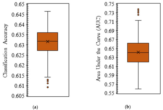 Figure 4 reveals the CA and AUC for 1022 models. The latitude and longitude are constant in all these models, along with 1 to 10 additional inputs. The Classification Accuracy values range from a minimum of 0.6092 to a maximum of 0.6465, with a mean accuracy of 0.6316. This indicates that, on average, the models correctly classified approximately 63.16% of the data points. Indeed, on average, the ELM frameworks have performed with moderate precision in forecasting dry spell categories. The quartiles (25th percentile at 0.6273 and 75th percentile at 0.6361) further confirm that most models have accuracies clustered around the mean, indicating a stable performance distribution across the different input combinations tested. The distribution of forecasts (IQR) is relatively low (IQR = Q3 − Q1 = 0.6361 − 0.6273 = 0.0088, less than 1%, 0.88%), indicating that the frameworks show fairly good stability in categorizing CDM. Specifically, the standard deviation is 0.0064, indicating that the models perform consistently around the mean accuracy. This consistency is beneficial as it suggests that the ELM frameworks have a stable performance in forecasting dry spell categories, with most models achieving similar accuracy levels. While appropriate variability is desired to reflect underlying climate uncertainty, the low variability in our models’ performance is advantageous. It indicates that the models are reliable and not prone to significant fluctuations, which is crucial for making consistent and dependable predictions. The interquartile range (IQR) of 0.0088 further supports this, showing that the models’ accuracies are closely clustered around the mean, reflecting a stable and robust forecasting performance.