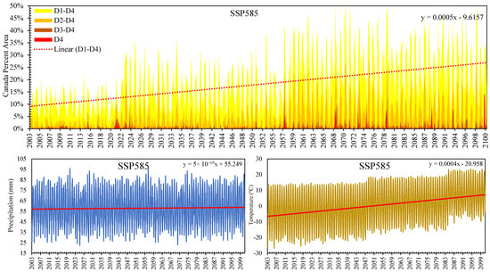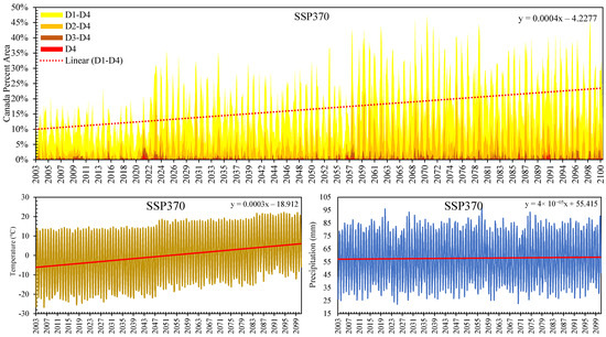 The linear trend of increasing drought-affected areas underscores droughts’ escalating frequency and severity over time. Similarly, the marked increase in temperature highlights the urgent need for effective climate change mitigation strategies. The relatively stable Pr levels across all scenarios suggest that changes in T are likely the primary driver of the increasing drought risk in Canada.