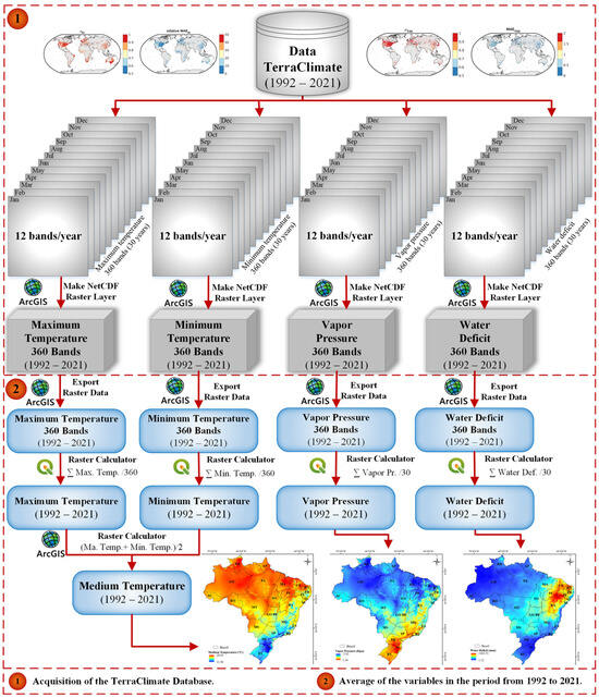 In this study, we analyzed the variables of maximum temperature (°C), minimum temperature (°C), vapor pressure (kPa), and water deficit (mm) over a 30-year period (1992 to 2021). The data, available in compressed NetCDF format with monthly records, were inserted into a GIS environment, where each band corresponds to a specific month. Working with data spanning three decades resulted in a total of 360 bands for each variable.