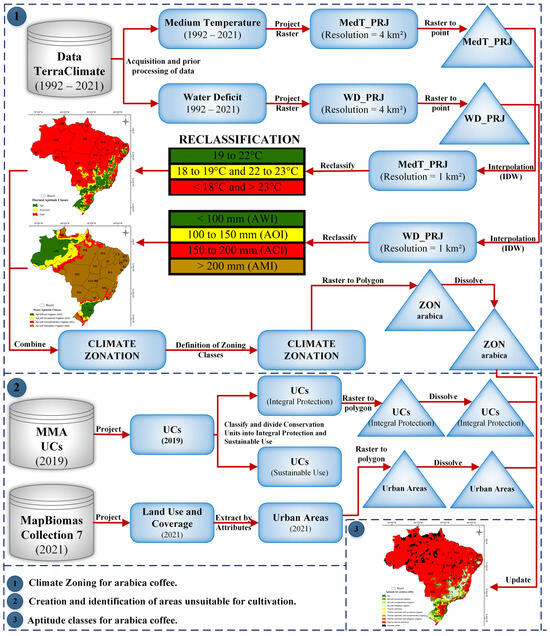 The methodological flowchart containing the necessary steps for the climatic zoning for Arabica coffee is presented in Figure 3 and was based on the methodology proposed by [27], using the ArcGIS® software.