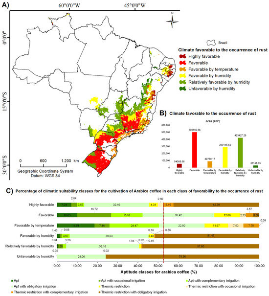 (A) Favorability for the occurrence of coffee leaf rust in areas apt and restricted for the cultivation of Arabica coffee; (B) areas of the favorability classes for the occurrence of coffee leaf rust; (C) percentage of Arabica coffee aptitude classes in each favorability class for the occurrence of coffee leaf rust.