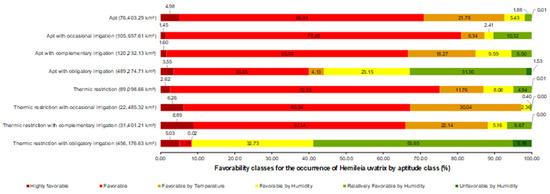 When analyzing the percentage of area occupied by each favorability class for the occurrence of coffee leaf rust, within the aptitude classes for the cultivation of Arabica coffee, it is noted that the class occupying the largest area is the favorable one, with the only exception being the thermal restriction class with obligatory irrigation. In this aptitude class, the relatively favorable class due to humidity stands out, occupying 53.65% of the area, which is equivalent to 244,756.48 km2 (Figure 6).