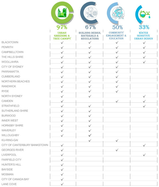 | City of Canada Bay The council presently uses—Resilient Sydney Strategy 2018 [38] | City greening to promote healthy lifestyles and enhance comfort | Distributed 500 seedlings to local residents Planted 1800 trees; Gave away 1500 plants |