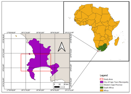 The study focused on the Metropolitan City of Cape Town, in the Western Cape province of South Africa. Cape Town as shown in Figure 1 is at the southernmost tip of the African continent, with a Mediterranean type of climate [25].