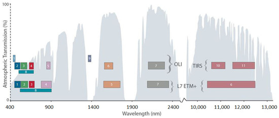 Landsat 8 Operational Land Imager (OLI)–Thermal Infrared Sensor (TIRS) images were used for the purposes of this study. As shows in Figure 2, Landsat 8 has 11 bands across a wavelength spectrum of 452–12,510 nm ranging from visible to thermal with three additional bands compared to its predecessors; namely, coastal (Band 1) at 400 nm, the cirrus cloud band at 1360 nm, and dual thermal bands between 10,600 and 12,510 nm [35]. The sensor is also equipped with a 15 m spatial resolution panchromatic band (B8) and 30 m resolution for the rest of the multispectral bands. The temporal resolution for both satellites is 16 days.